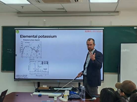 2025年12月2日下午, Andreas Hermann教授在东教楼1104学术报告厅为黄色直播 部分物理学专业和材料与化工专业的博士生、硕士生和青年教师作了题为“From DFT to thermodynamic modelling”的学术报告。报告以近期关于“同时具备固体与液体特征的新物态”的报道为切入点,系统阐述他们研究团队在高压物理与计算材料学领域的系列工作。Andreas Hermann教授从钾的高压相图与非共格宿主—客体结构详细阐述了“链熔融”作为一种热力学中间态的证据与机制,提出了碱金属高压相可作为部分电子化合物的观点,展示了如何利用机器学习分子动力学模拟预测相变、熔化线极值及热力学性质,介绍了基于Bragg-Williams模型的两态热力学理论,解释了金属熔化线中的临界行为。此外,Andreas Hermann教授还介绍了第一性原理计算在高压冰(VII–VIII–X)相变研究中的应用,探讨了隐藏临界点与相图拓扑等前沿问题,展望了机器学习在预测复杂材料行为方面的潜力。报告期间,Andreas Hermann教授与在场师生就高压相变机理、机器学习势函数开发等相关问题展开了深入讨论并细致回答了师生提问。