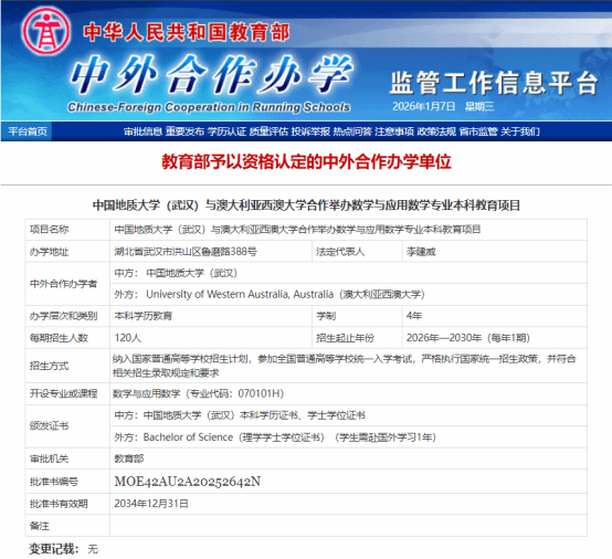 该项目计划于2026年正式启动招生,采用“3+1”中外合作培养模式,通过全国普通高等学校本科招生统一考试选拔合格生源,年度招生规模不超过120人。项目实行四年制本科培养,前三年学生在我校完成全日制课程学习,成绩达标者第四年将赴西澳大学开展后续深造。学生修完两校规定课程、达到双方毕业与学位授予要求的,可同时获得中国地质大学(武汉)本科毕业证书、学士学位证书以及西澳大学学士学位证书(数据科学)。对于按要求完成本项目的学生,西澳大学将优先录取其攻读相关专业硕士学位。