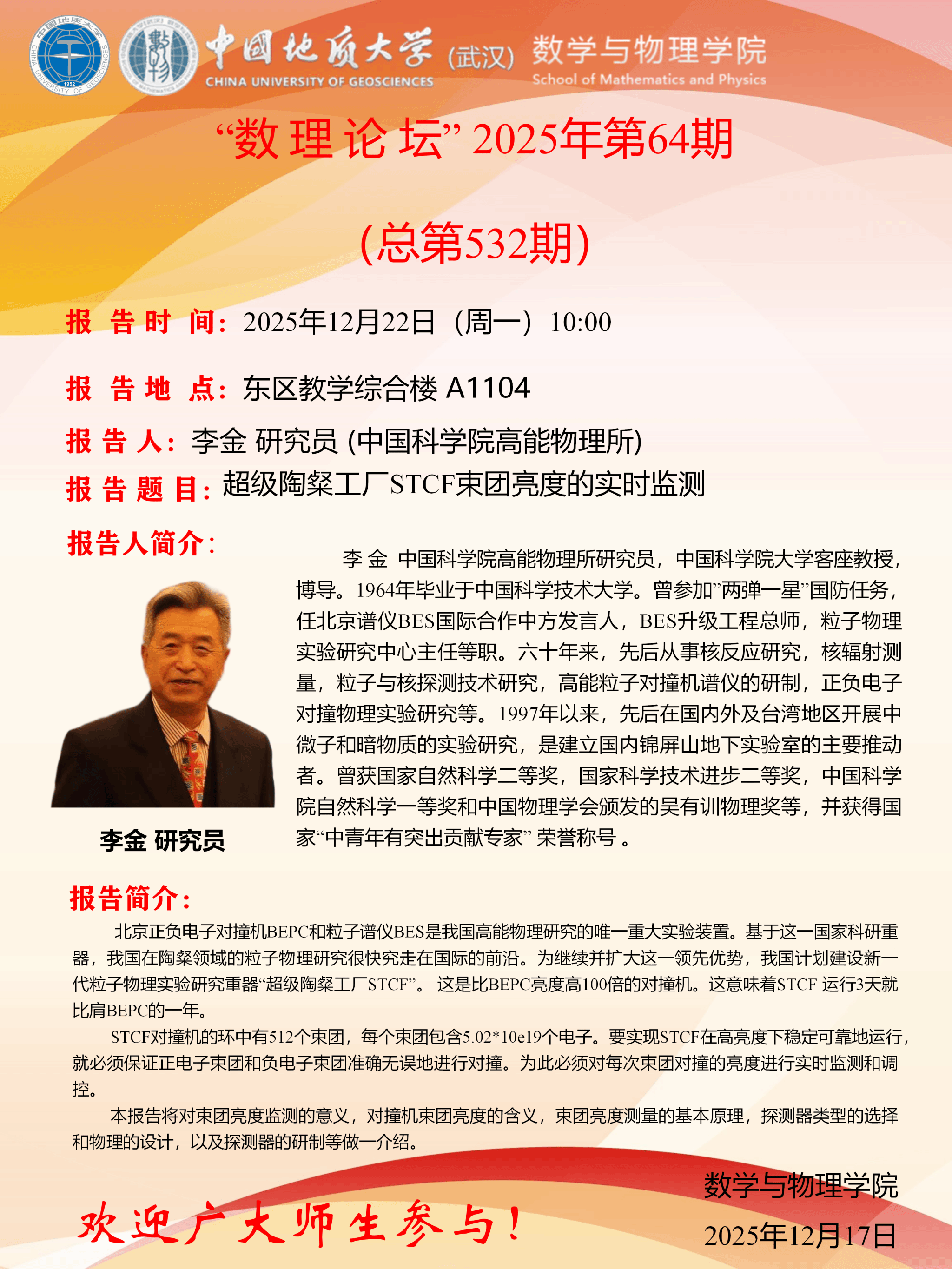 2025年12月18日李金研究员学术讲座:超级陶粲工厂STCF束团亮度的实时监测